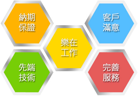 我們能夠化被動為主動地面對客戶,適時關切客戶的需要,並站在客戶的立場思考問題、解決問題,同仁之間更力求溝通順暢、工作流程明快,真正做到:精準掌握「先端技術」、提供全方位「完善服務」、準時交件之「納期保證」、品質效能讓「客戶滿意」、並帶領全體員工「樂在工作」。